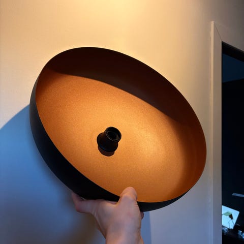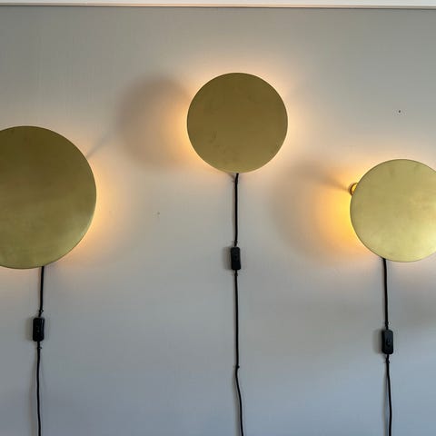 Vegglampe Fullmoon i metall blir en pen interiørdetalj. Gir et lekkert, indirekte lys, og er en fin dekor når den er slukket. Det er fint å sette flere sammen i gruppe på veggen. Farge pale gold. Veggavstand 11 cm. Diameter 35 cm. Tekstilledning 2,5 meter.