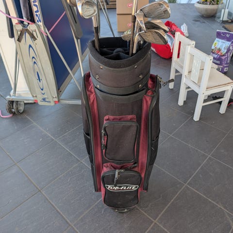 Golfbagen er i god stand, men litt solbleket på utsiden.