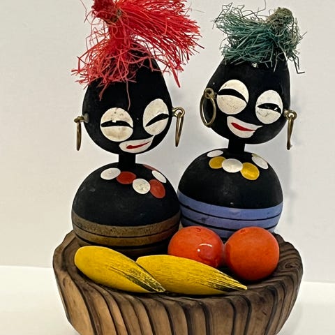 Hodet er laget av den øvre delen av et kokosnøttskall og håret er laget av kokosfiber.