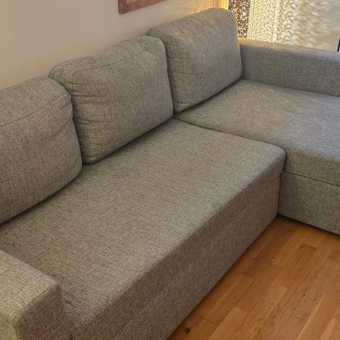 Hjørnesofa som kan omgjøres til sovesofa. Sofaen er trukket i grå tekstil og har løs rygg- og seteputer. Den har en uttrekkbar del som gir soveplass, samt integrert oppbevaringsskuff under sitteflaten. Passer som hovedsofa eller ekstra soveplass i stue, gjesterom eller hybel.størrelse 230*150