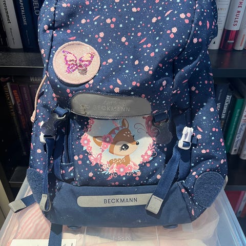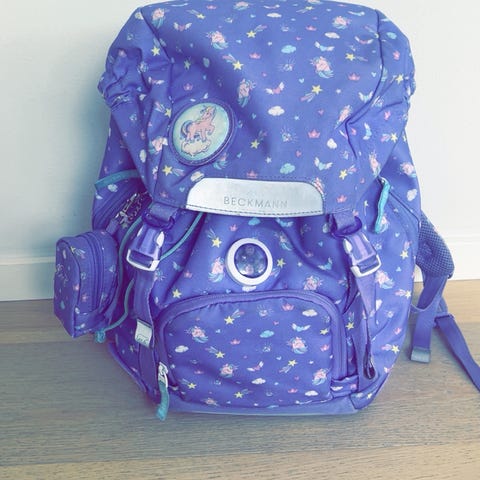 Beckmann skolesekk i rosa. Pent brukt. Regntrekk medfølger. 350,-