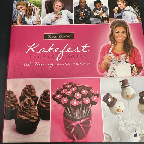 Tone Oraini Kakefest kokebok med oppskrifter og ideer til kaker og cake pops. Boken inneholder trinnvise beskrivelser og illustrerte eksempler på ulike kaker og dekorasjoner til selskap og sammenkomster. Innbundet bok med fargebilder. Svært lite brukt.