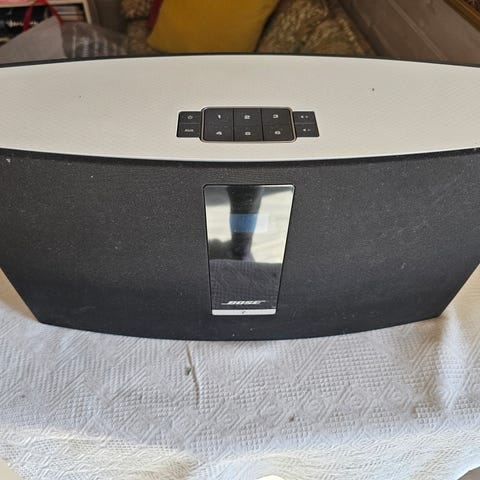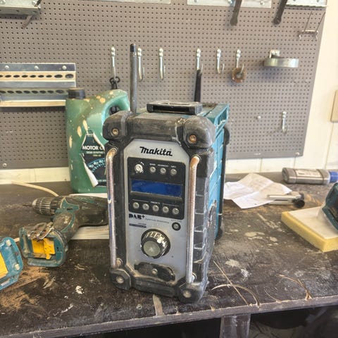 Bosch Professional byggeplassradio med integrert høyttaler. Radioen er bygget inn i en beskyttende ramme med bærehåndtak på alle sider. Fronten har betjeningspanel med display, knapper og tilkoblinger. Enheten er beregnet for bruk på byggeplass eller i verkstedmiljø, der den kan brukes til radiolytting og avspilling av lyd fra tilkoblede kilder. Strømtilkobling via kabel, og enkelte modeller kan også drives av kompatible Bosch-batterier (se modellspesifikasjon på enheten for detaljer).