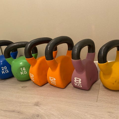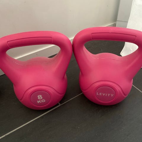 Ubrukt kettlebell 12 kg i lys blå farge med metallhåndtak. Egnet til styrketrening, funksjonell trening og kondisjonstrening.