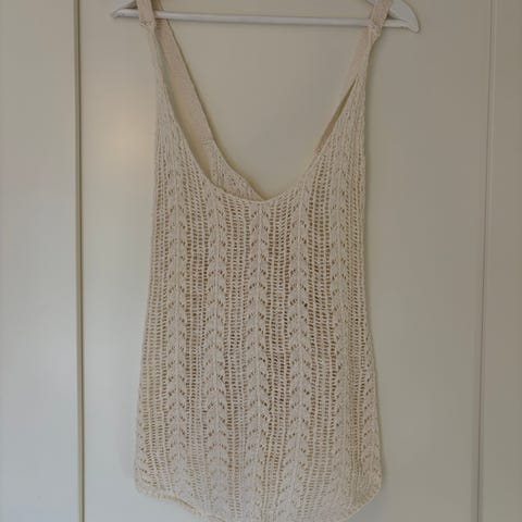 H&M sommerkjole for dame i størrelse M. Kjolen er beige og laget i bomull. Den har heklet eller strikket struktur og tynne, justerbare stropper med ringdetalj bak. Passer som lett sommerkjole eller over badetøy på varme dager.