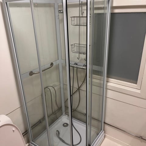 Dusjkabinett med buet front i klart glass og sølvfargede profiler. Kabinettet har skyvedører og er plassert i hjørne, tilpasset flislagt baderom. Egnet for standard dusjoppsett med avløp i gulv og tilkobling til eksisterende rør og armatur.