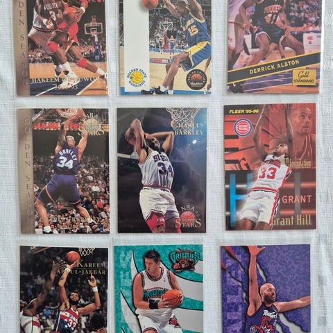 Kortene egner seg som samlerobjekter for basketballinteresserte og kan sorteres etter lag, spiller eller serie. Antall kort og eksakte årganger fremgår ikke av bildene og bør eventuelt avklares nærmere ved behov.