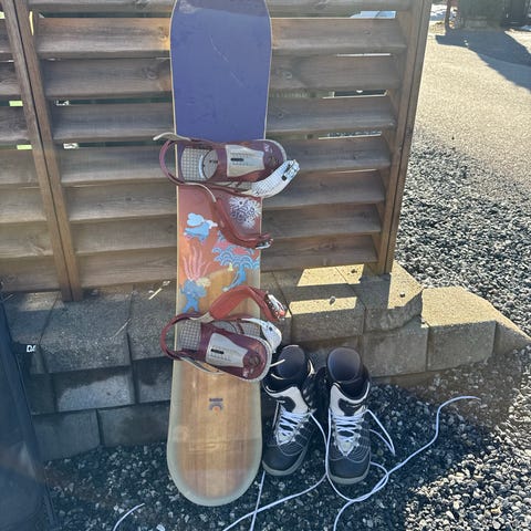 Snowboard med bindinger og tilhørende snowboardstøvler.