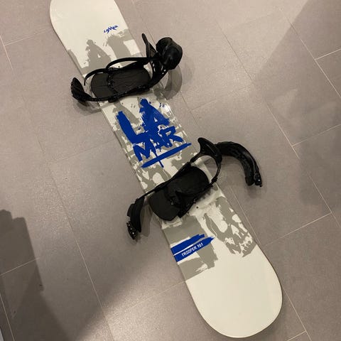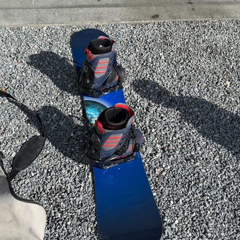 Brettet har overflate i svart og blå farge, med monterte bindinger. Støvlene er høye snowboardstøvler i svart farge, tilpasset bruk med bindingene på brettet.