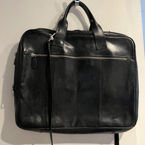Praktisk pc-veske , m/ skulderrem, mange lommer innvendig og utvendig lomme med glidelås .