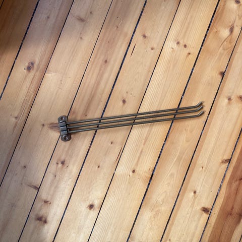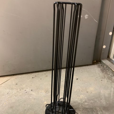 Frittstående klesstativ i svart metall med enkel bøylekonstruksjon og bunnramme for plassering av sko eller esker. Egnet til oppheng av klær i gang, soverom eller bod. Må stramme skruer