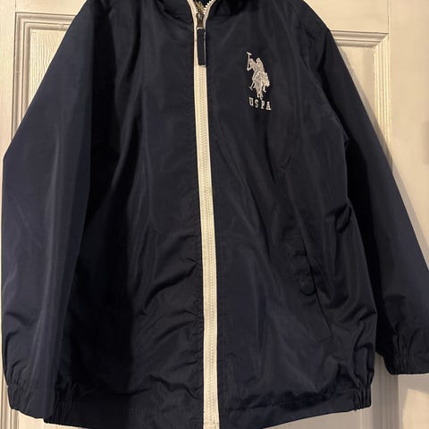 Mørk blå og rød anorakk, tynt stoff. Polo, størrelse 110. Pent brukt.