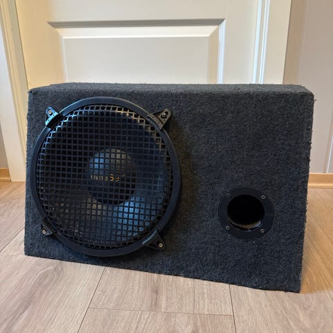 Høyttaleren står i en rektangulær kasse trukket i mørkt stoff, med én stor basshøyttaler i front og to runde bassporter øverst. Egnet til bruk i bil eller som del av et anlegg der man ønsker ekstra bass.
