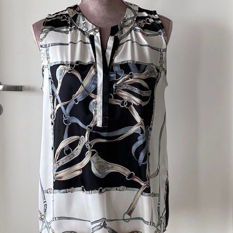 Tunikaen er brukt og har litt normal bruksslitasje (noen bittesmå nupper synlig på veldig nært hold og litt strekk i sømmen ved det ene ermefestet - uten ranking eller hull). Helhetlig veldig pen, men rimelig pris pga slitasjen!