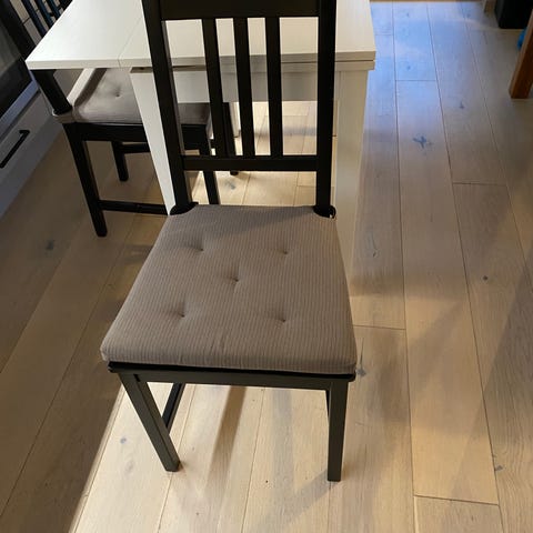 Slåke koksgrå jærstoler med 4 spiler i rygg og ull sete selges. En har brist i øverste spile, men fungerer normalt.