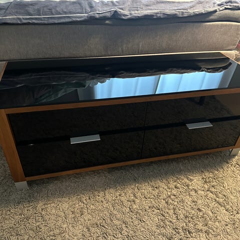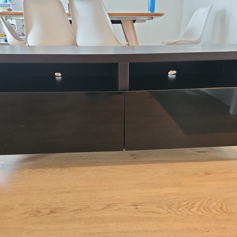 Mediabenk med tilhørende vegghylle selges billig. Gode lagringsmuligheter i skuffer og skap.