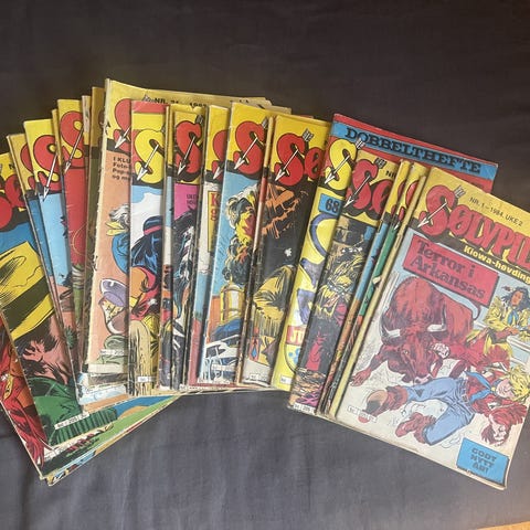 Mange blader sølvpilen fra 1976-1986 gis bort, ca. 100 blader. Sannsynligvis ikke noen komplette årganger, og flest fra tidlig 80-tallet. Bladene er godt brukt, noen har løse omslag og noen er skrevet i der det er oppgaver. Permene har skader.