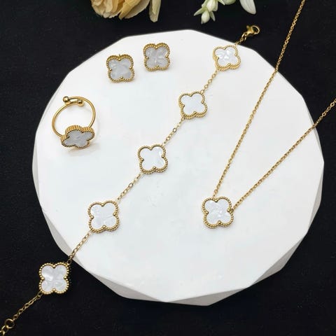 Kløversmykkesett. Nytt. Settet inneholder øredobber, kjede, ring, armbånd