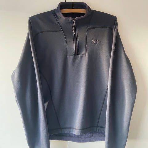 Peak Performance R&D genser for herre i størrelse L. Genseren er blå med kontrastsømmer og halv glidelås i halsen. Materialet er akryl. Passer som mellomlag eller fritidsplagg i kjøligere vær.