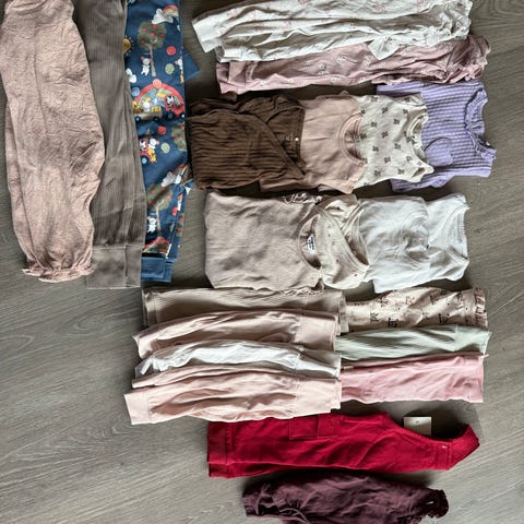 Newbie, Lindex, kappahl, hm og cubus babyklær for jente i størrelse 68. Pakken inneholder ulike plagg i hovedsak i beige og naturtoner, blant annet bukser, bodyer og en selebukse. Klærne passer til baby i størrelse 68 og er egnet til hverdagsbruk. Materialet ser ut til å være mykt og komfortabelt for barn, typisk bomullsblandinger. Fargene går i beige og dus rosa med enkle mønstre og detaljer som volanger og striper.