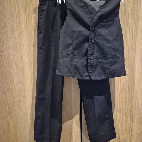 Lindex dressett i størrelse 122. Består av hvit langermet skjorte, og grå vest og bukse. Selges for kr 150.