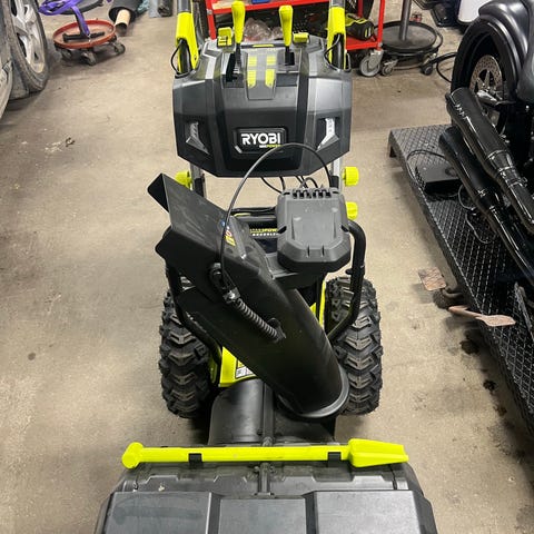 Pent brukt Ryobi snøfreser selges med batterilader og batteri.