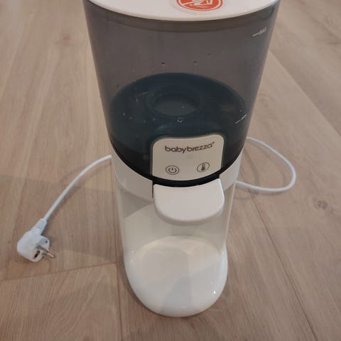 Baby Brezza Formula Pro pulverdispenser i hvit plast med mørk, gjennomsiktig beholder. Enheten er beregnet for automatisk dosering og blanding av morsmelkerstatning til tåteflasker. Frontpanel med knapper for betjening, samt uttak foran for plassering av flaske under tilberedning. Egnet for bruk på kjøkkenbenk eller annet stabilt underlag ved mating av spedbarn.