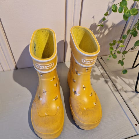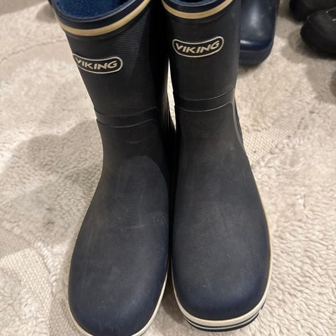 Viking gummistøvler for barn, unisex, i størrelse 25. Støvlene er i blå farge med lyse såler og detaljer. Grovmønstret yttersåle gir godt feste på vått og glatt underlag. Passer til bruk i regnvær, på tur og i barnehage eller skole når det er vått ute.