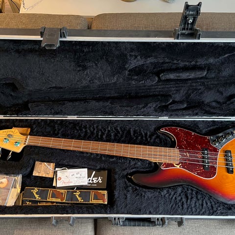 Bassen er som ny og fungerer som den skal. Lite brukt og godt tatt vare på. Originale pickups, hardware og elektronikk. Leverer den typiske varme og tydelige Jazz Bass-lyden.