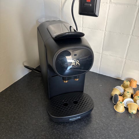 C3 S04 espressomaskin i sølv og svart. Maskinen drives på 220–240V, 50/60Hz med effekt på 950W. Den har avtakbar vanntank bak og front med dryppbrett. Egnet for tilberedning av espresso hjemme på kjøkkenbenk eller kontor. Modellnummer 30-10261, type S04, produsert i PRC.