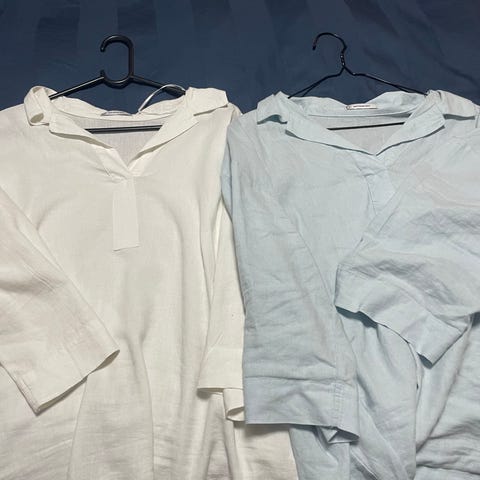 Selger to flotte Jean Paul t-skjorter i lyseblå og mørkeblå, samlet for 399 kr.