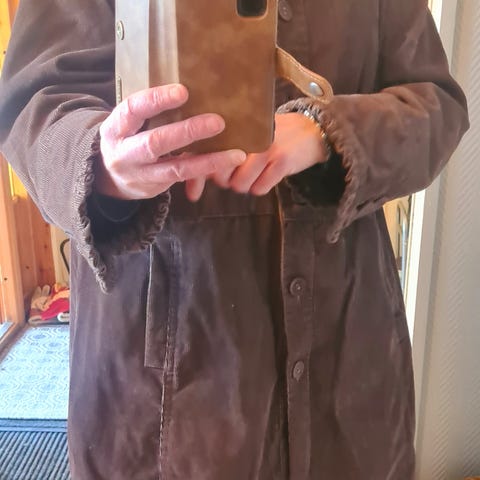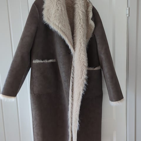Zara kåpe for dame i brun fuskepels i størrelse L. Kåpen har hel lengde og er laget i mykt, skinnlignende materiale utvendig og pelslignende innvendig. Den lukkes foran og har lommer i sidene. Passer som ytterplagg på kjølige dager og kan brukes til både hverdags og mer pyntede anledninger.