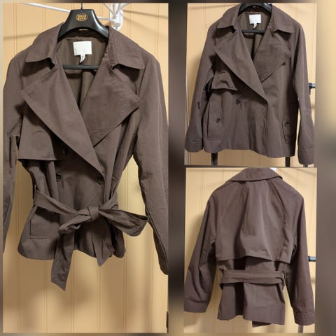 Helforet og har både knepping og glidelås. Justerbar midje, jf. bilde 2. Knappene på venstre side er flyttet litt ut for å øke vidden. Hette integrert i kragen - skjules med glidelås når ikke i bruk. Pent brukt. Passer til person som er ca 160-165 cm.