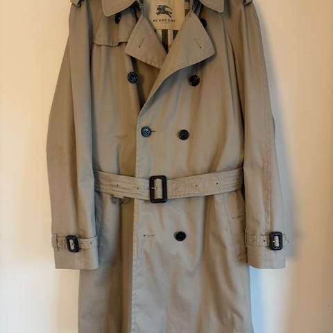 Burberry kåpe for herre i størrelse M. Jakken er grå og i regn avvisende materiale.