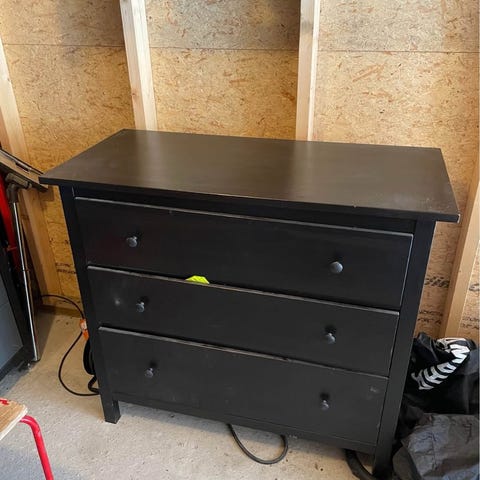 Øverste skuffe trenger en liten ekstra dytt for at den skal gli på plass. Bunnen må inn i sporet kanskje, sikkert enkelt å fikse, men jeg har kjøpt ny kommode så selger den til noen som gidder med det, Ellers helt ok stand. Satt den i garasjen.