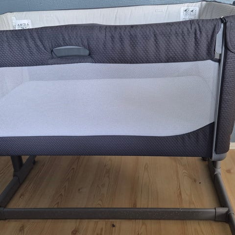 Fin, grå Roomie bedside crib fra Joie med en justerbar bunn. Den har en justerbar høyde og fire låsbare hjul. Bedside crib-en har god ventilasjon og vaskbare trekk.