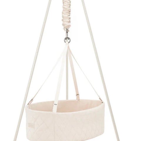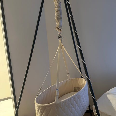 Oval moonboon selges. Kun brukt en kort periode, av ett barn, i røyk- og dyrefritt hjem. Kjøpt ny i 2025. Det medfølger sengehimmel, to laken, myggnetting og madrass. Det er bluetooth-kobling opp mot en enkel app, noe som gjør det smidig å starte og stoppe vuggingen.