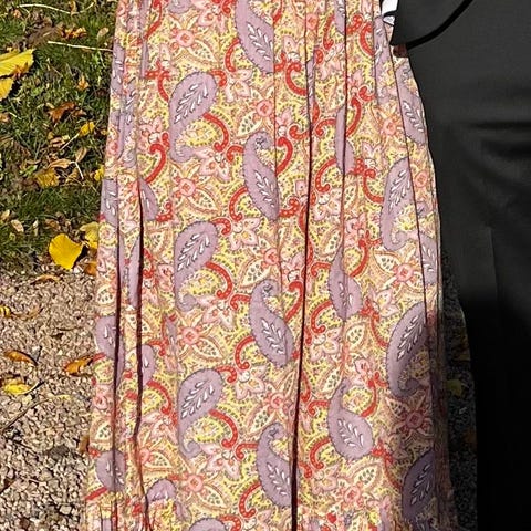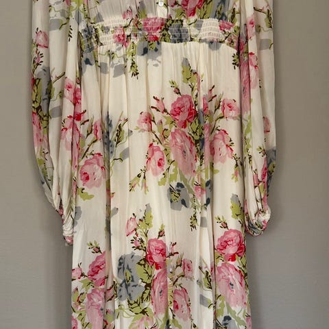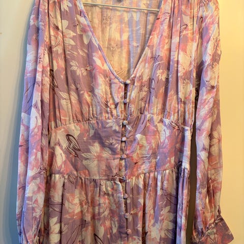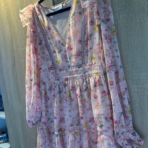 byTiMo kjole til spesiell anledning i størrelse XS. Kjolen har et flerfarget blomstermønster med lys bunnfarge. Modellen har lange ermer med mansjetter, v-utringning og markert midje med rynkedetaljer. Skjørtet er lett utsvingt med volangkant nederst. Passer til bruk ved ulike anledninger der en mer pyntet kjole er ønsket. Den er kjøpt fra Reli pre loved. Orginal pris var 3500kr. Brukt kun 2 ganger.