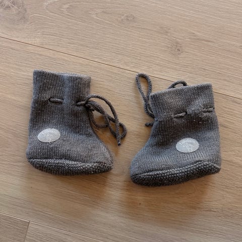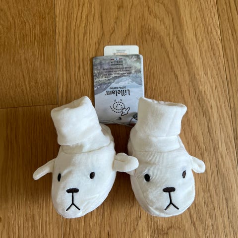 Lillelam babytøfler i 100% ull. Søte med Mummi motiv. Mellomgrå farge. Str 74-80 cm. Nye med lappen på, rakk ikke bruke disse før de ble for små.