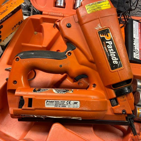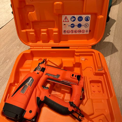 Paslode spikerpistol i oransje plast/metalldesign. Leveres i formstøpt plastkoffert med plass til maskin, gasspatroner og tilbehør. I kofferten følger det med lader og flere gasspatroner slik det vises på bildet. Spikerpistolen er egnet til spikring i treverk og lignende konstruksjoner der man trenger rask og jevn innskyting av spiker. Bruker gasspatroner og oppladbart batteri som energikilde. Passer til profesjonelt bruk og hobbybruk innen snekring og montering av treverk, panel og lignende oppgaver der en håndholdt spikerpistol er praktisk.