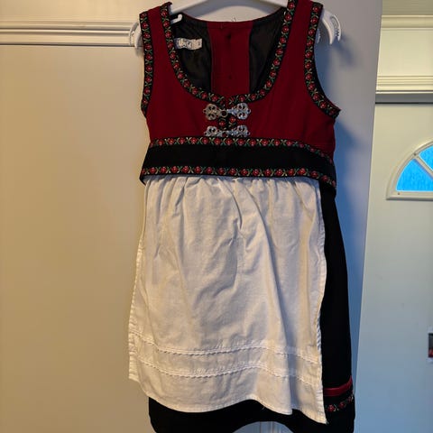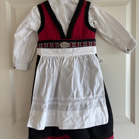 bunadskjole for jente i størrelse 98. Kjolen er flerfarget med rød overdel, mørk skjørtedel og hvitt forstykke. Tradisjonspreget modell med dekorative bånddetaljer og spenner foran. En flekk foran (prøvde ikke å fjarne) og to nupper på baksiden.