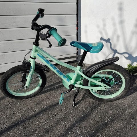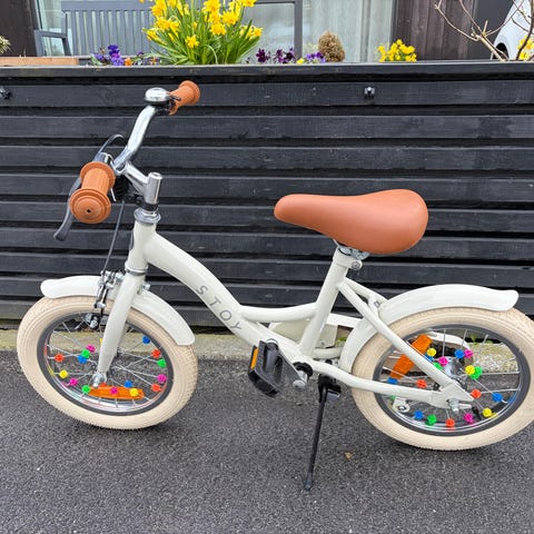Stoy barnesykkel med 16" hjul i grønn farge. Sykkelen har lav innsteg-ramme som gjør det enklere for barnet å komme av og på. Utstyrt med lys brun sal og matchende holker, samt lyse dekk. Sykkelen har fotbrems bak og håndbrems foran, støtte og reflekser på hjulene. Egnet som barnesykkel i overgangen fra mindre til større hjulstørrelse, typisk for barn som passer 16" sykkel. Passer til barn fra 5-7år. Støttehjul følger med.