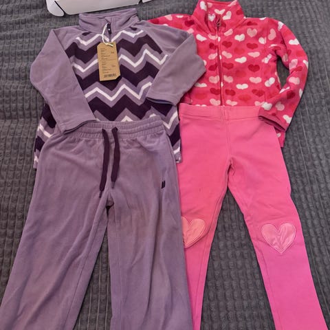 - Én fleecejakke uten hette i kremfarge med rosa felt og glidelåslommer.