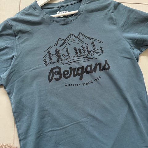 Bergans Graphic Wool Tee t-skjorte for herre i størrelse L. T-skjorten er blå og laget i merinoullblanding, med hovedmateriale i merinoull. Den har rund hals og kort erm, samt en enkel grafisk Bergans-logo på brystet. Egner seg godt som innerlag eller lett mellomlag til hverdagsbruk og friluftsaktiviteter. Materialet er tynt og mykt, og kan vaskes på ullprogram etter anvisning på vaskelappen.