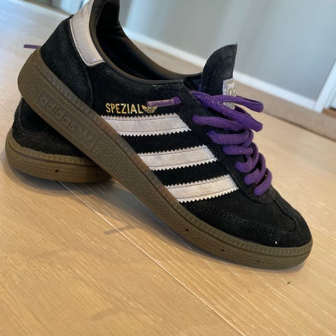 Pga skoen har vært litt trang, så er det gnisset et lite hull bak i hælen på den ene, se bilde. Fremstår ellers lite brukt, og har mye bruk igjen. Er vannavstøtende, og har vært imprignert hos XXL. Adidas Equipment joggesko i størrelse 38 for unisex. Skoene er hovedsakelig svarte med lyseblå lisser og detaljer, samt hvite Adidas-striper på sidene. Overdelen er i syntetisk materiale og mesh for ventilasjon. Yttersålen har kraftig mønster for godt grep. Egnet som fritids- og treningssko for barn eller unge med skostørrelse 38.