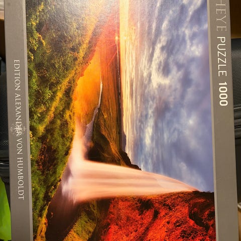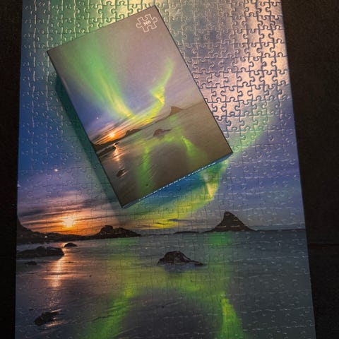 Lofoten Northern Lights puslespill med motiv av nordlys over Lofoten. Puslespillet består av 1000 brikker. Ferdig motiv måler 68 x 48 cm (27" x 19"). Motiv og informasjon på esken viser norsk flagg og engelsk tittel på motivet. Passer for ungdom og voksne som liker puslespill med naturmotiv.