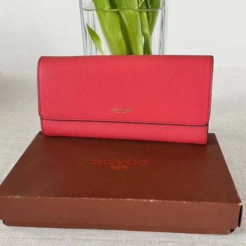 Coach lommebok i stoff for dame. Lommeboken har lilla mønstret yttermateriale med karakteristisk Coach-logo, samt detaljer i matchende materiale. Innvendig er det flere kortlommer, egen lomme med vindu for ID eller bilde, samt rom for sedler. På baksiden er det en glidelåslomme som kan brukes til mynter eller småting. Praktisk størrelse som får plass i de fleste vesker.
