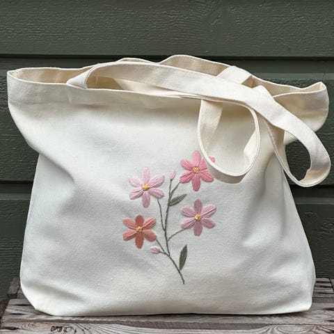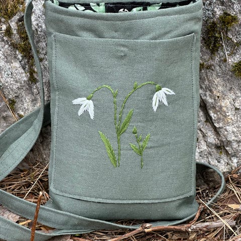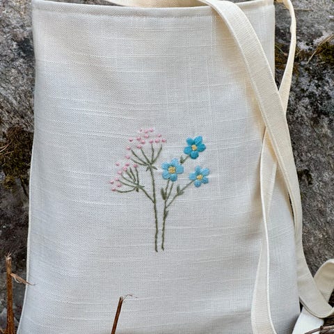 Søt ,naturfarget veske, sydd og håndbrodert av meg. Stoffet består av 75% lin,25% bomull, foret med paisleymønstert viskose. I foret har jeg sydd 2 lommer i lin.Bunnen er av kunstskinn.Måler 27x27 cm.Bunnen måler 7 cm. Vesken er ny,ferdigsydd i går 😊 Se gjerne de andre annonsene mine med flere håndlagede tekstiler,som veggtepper,div håndbroderte og sublimerte klær ,capser,bilder mm .