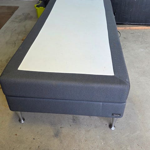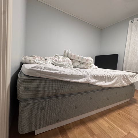 Bohus seng med ramme og overmadrass gis bort grunnet flytting. Sengen består av en enkel treramme med ben og en overmadrass i lys farge med mørk kant. Passer som vanlig sengeløsning på soverom eller gjesterom. 180x200. uten overmadrass og «skjørt» rundt rammen.