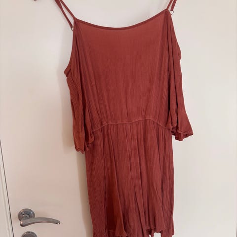 👚Toppen er brun/orange-og hvitstripet med tynne stropper og knappelukking foran.